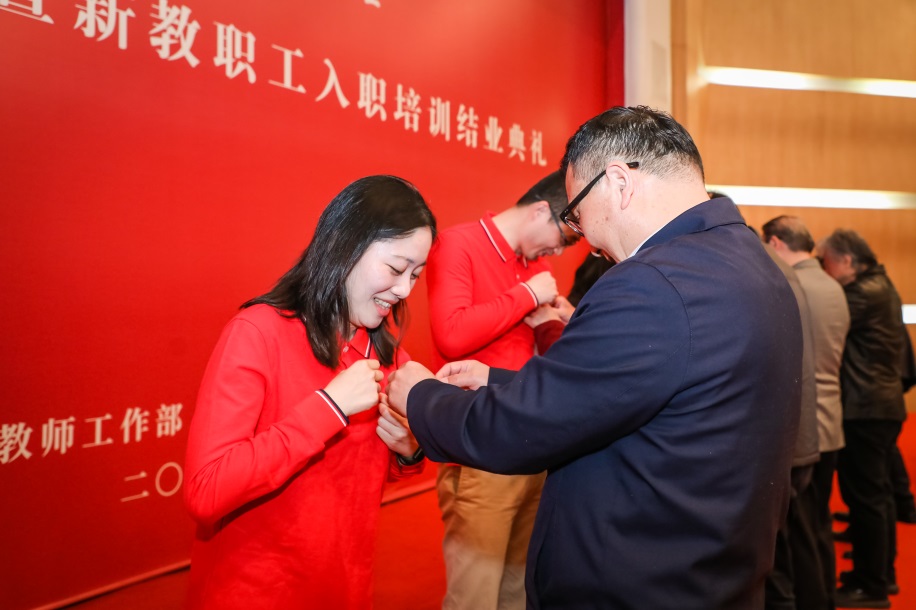 活动中,荣休教师为新教职工佩戴校徽,新教职工为荣休教师献戴红围巾,在庄重、温馨的“薪火相承”仪式中传递礼敬教师、赓续传承的深刻寓意。