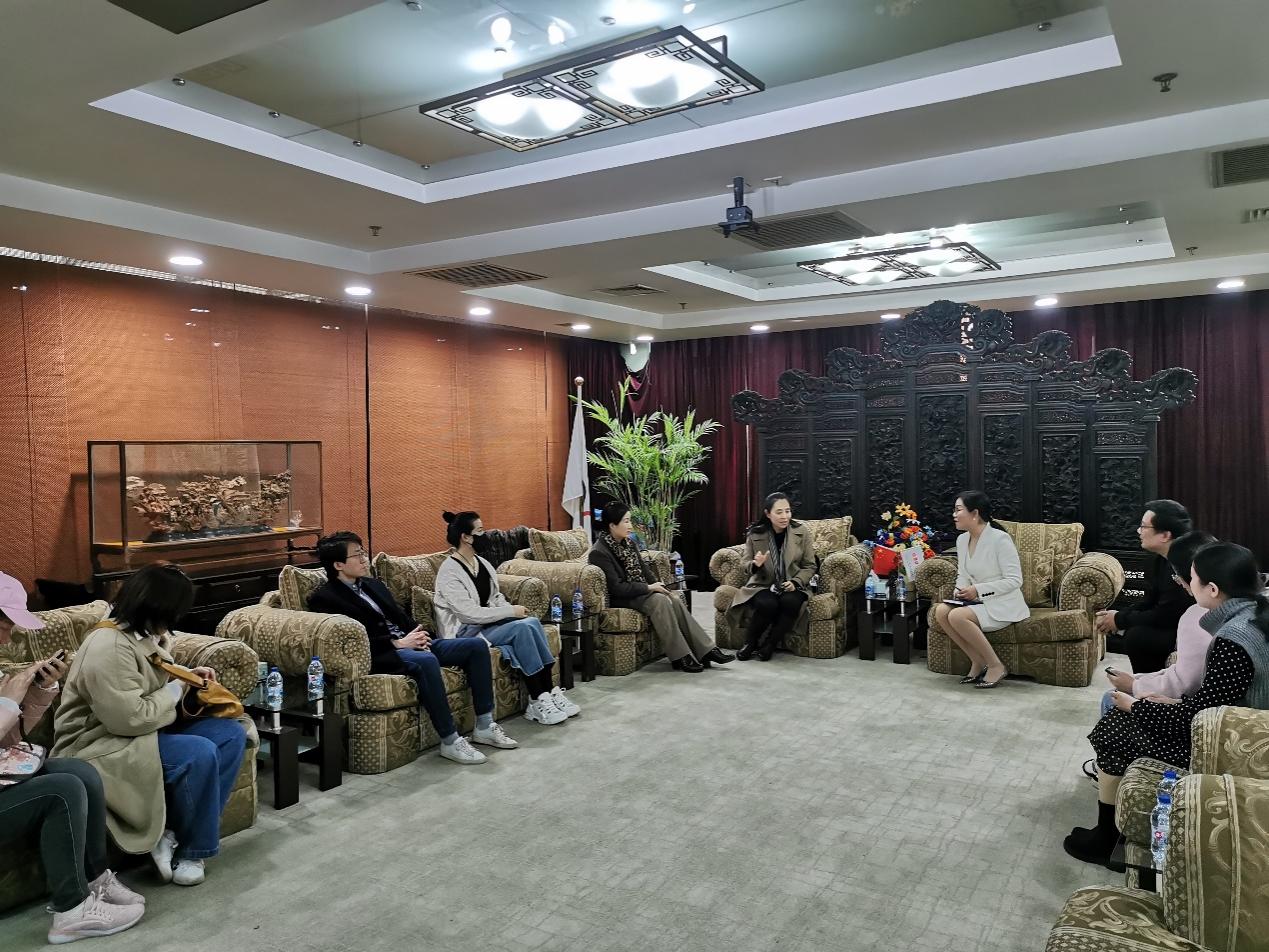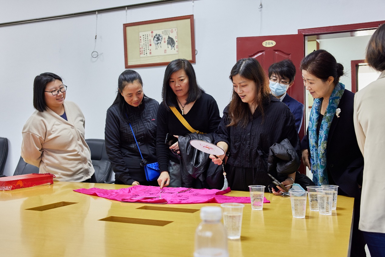 回访小组与吴主任就松江顾绣传承与保护情况进行了讨论交流,她谈到松江文化馆顾绣工作室与松江地区的中小学和高校都有合作,在学校中开设顾绣选修课程,也对社会人士开设公益的培训课程,但如今因培养周期长等原因面临着无法吸引年轻人才加入的传承困境。回访老师相应提出建议,并表示顾绣工作室可以与服装与艺术设计学院有更深入、更多样的合作。