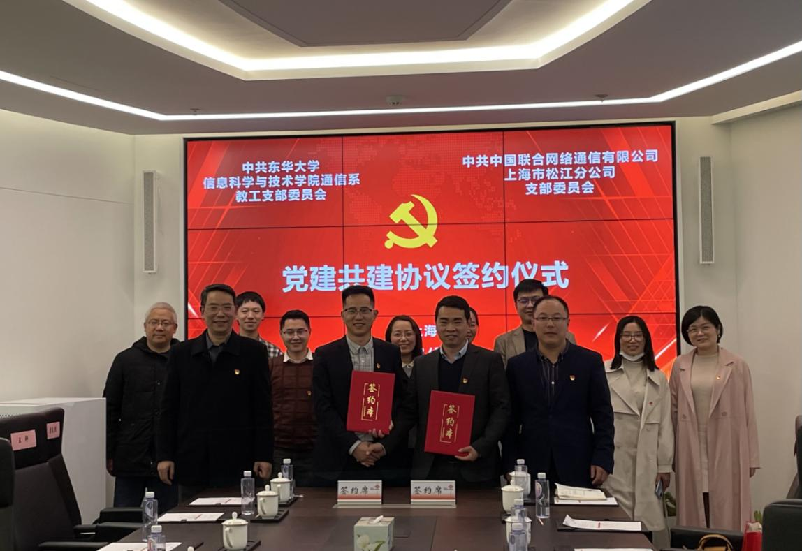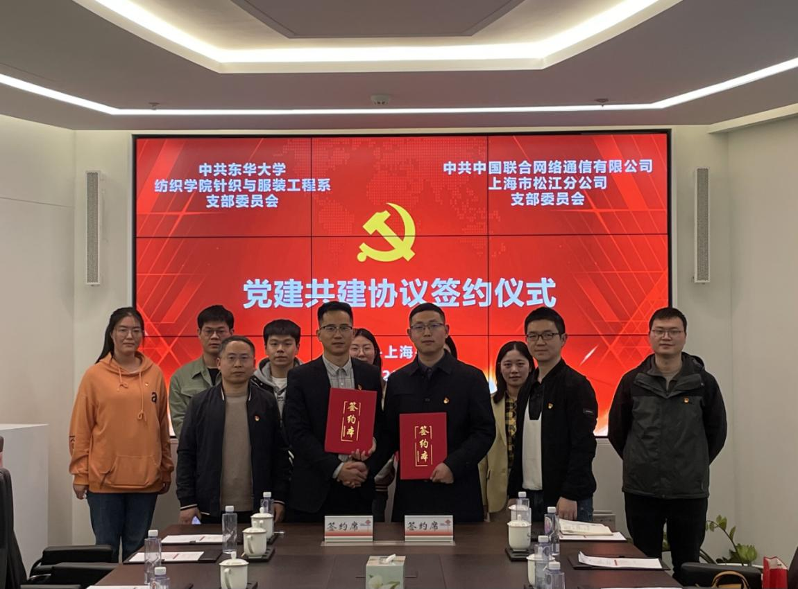 最后,由信息科学与技术学院通信系支部崔恒荣、纺织学院针织与服装工程系支部付少举分别与松江联通党支部代表汪钊签署党建共建协议书。