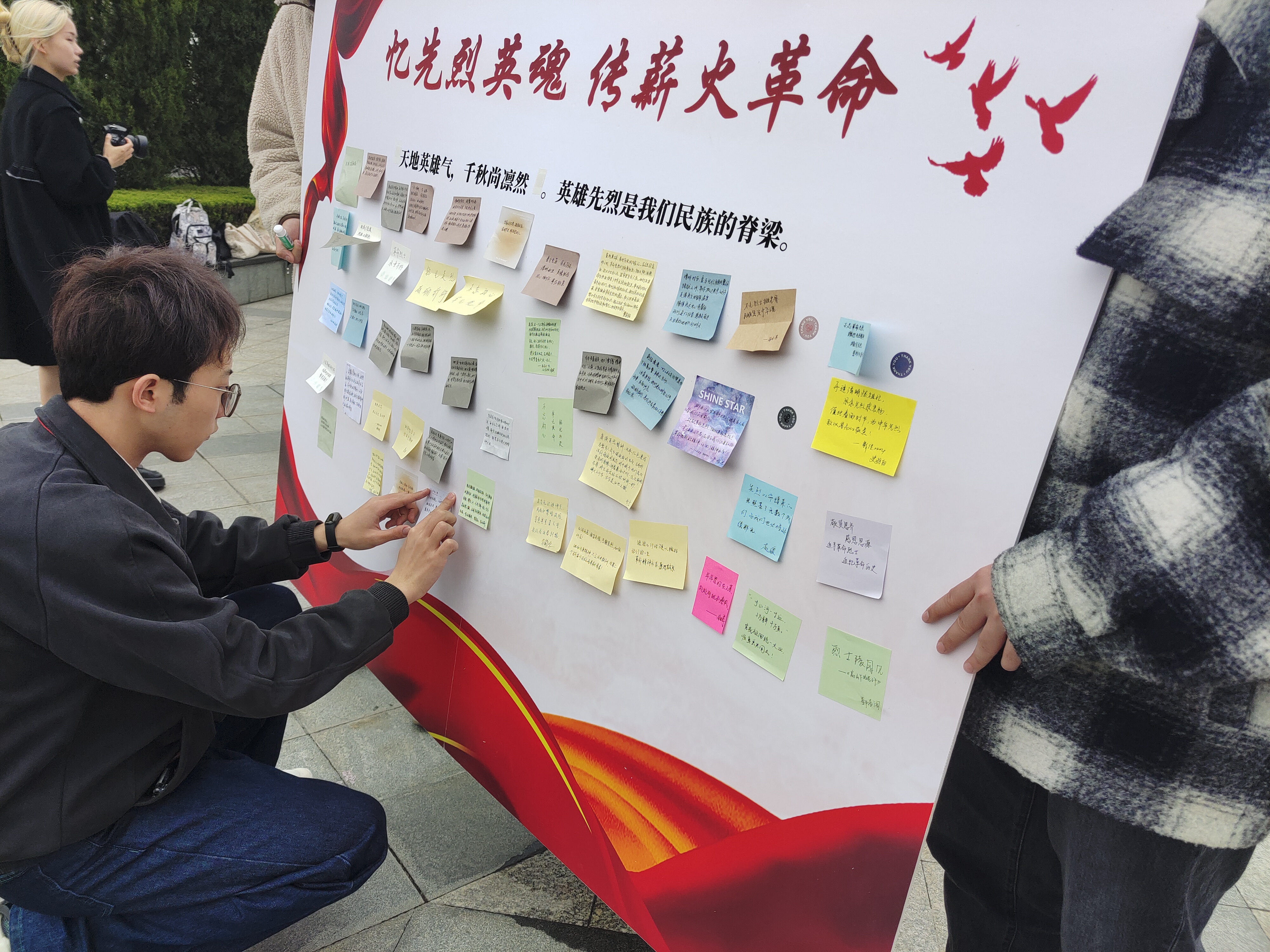 “天地英雄气,千秋尚凛然”。缅怀先烈,是对近代以来为争取民族独立、国家富强、人民幸福而牺牲英烈的深情礼赞,更是对中华民族精神血脉的赓续和传承。活动最后,团学骨干代表将自己对于本次活动的感想与对祖国美好的祝福,张贴在留言板上。同学们纷纷表示要发扬中华血脉里的不朽民族魂、继承英雄先烈们的革命遗志,坚定马克思主义信仰、中国特色社会主义信念、实现中华民族伟大复兴中国梦信心,争做英雄精神的坚定信仰者、有力传播者和积极践行者,以永不懈怠的精神状态和一往无前的奋斗姿态投身强国伟业,在实现中华民族伟大复兴中国梦的时代洪流中踔厉奋发、勇毅前行。