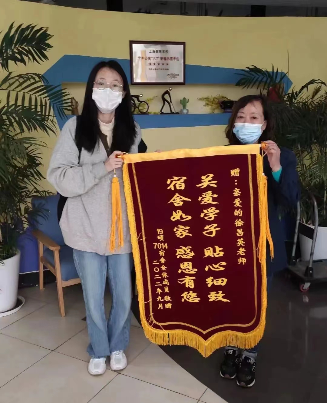 徐昌英阿姨,学生送给您的锦旗请查收!徐阿姨,是松江校区学生公寓楼的管理员,像往常一样在公寓楼里忙活的她意外地收到一份特殊的礼物,化学与化工学院研究生潘攀同学将一面绣着“关爱学子、贴心细致、宿舍如家、感恩有您”的锦旗送到了她的手中,字里行间充满了对宿管阿姨徐昌英的感激。
