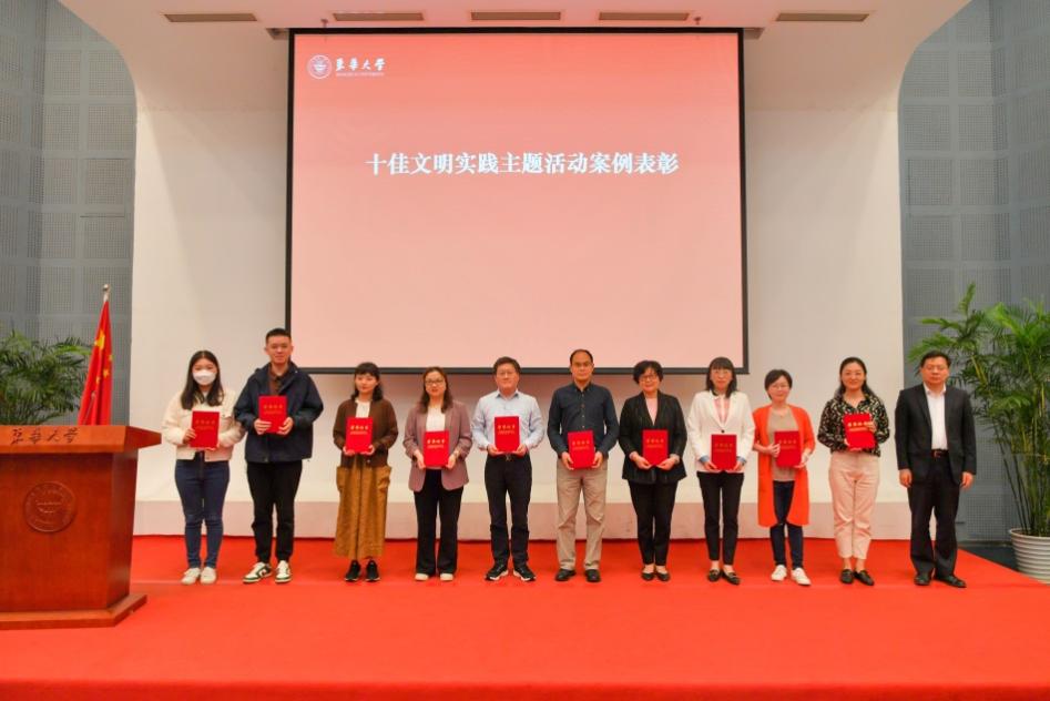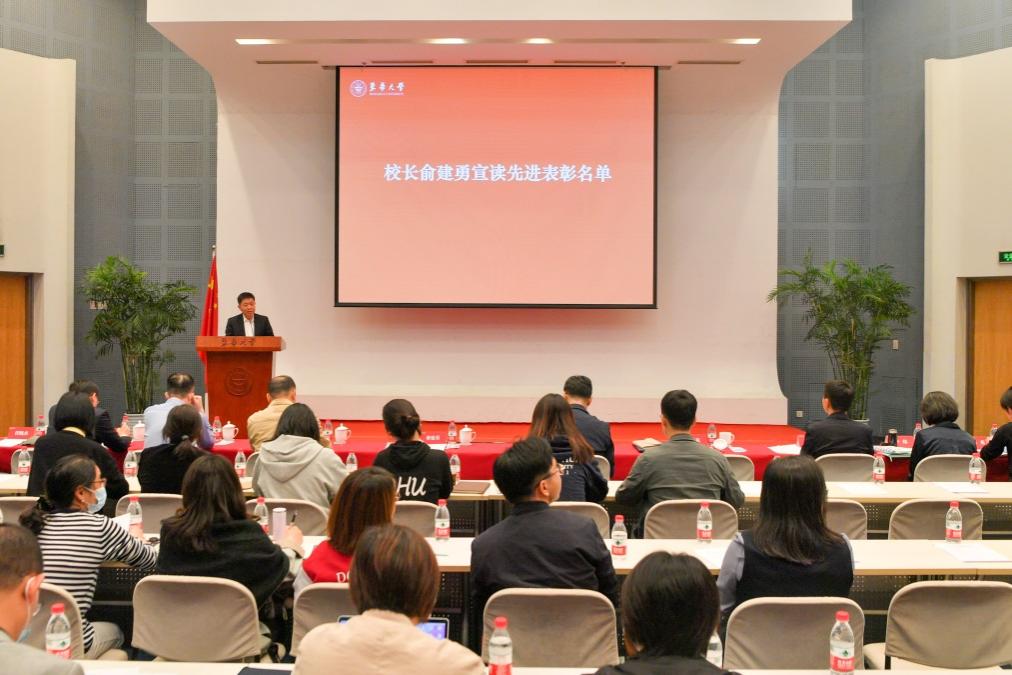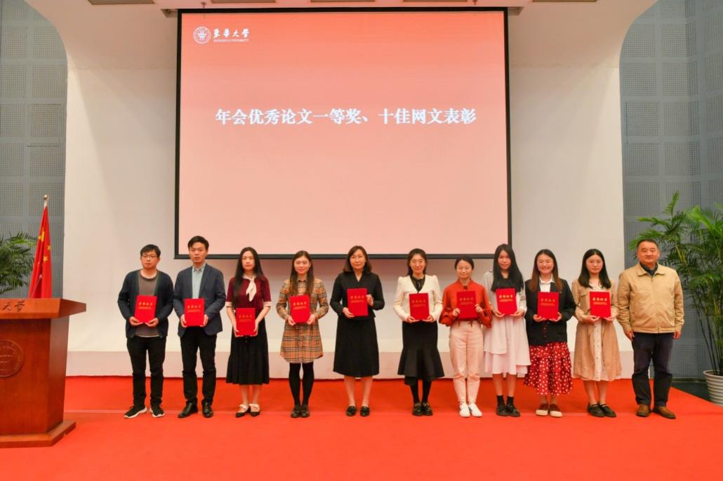俞建勇在会上宣读表彰名单,会议表彰了年会优秀论文、十佳网文、2022年度十佳校园新闻、2022年度学生工作先进集体、2022年度学生就业创业工作先进集体以及“学习二十大 创文明校园”十佳文明实践主题活动案例。
