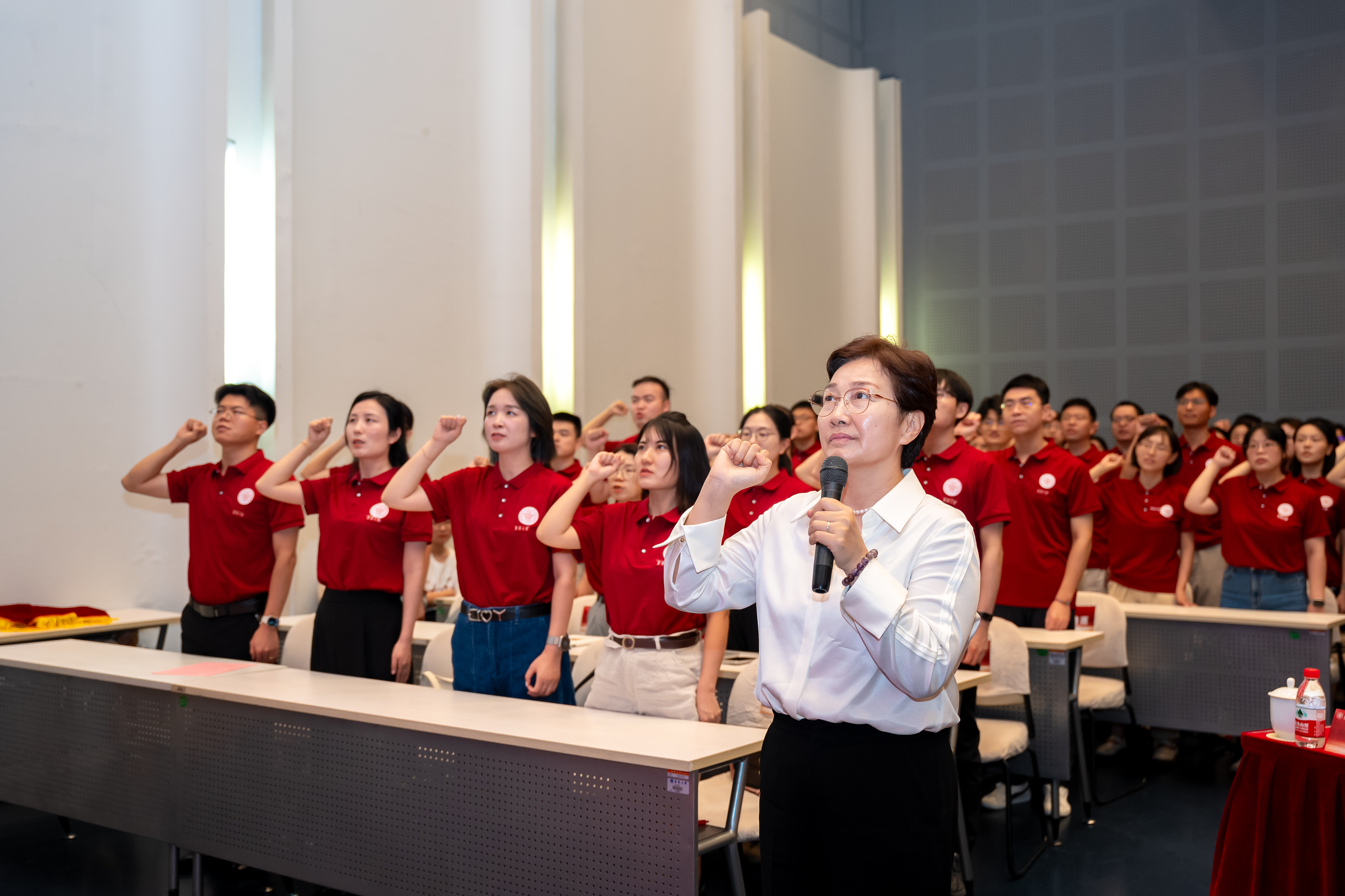 全体新进教师在信息科学与技术学院教授郝矿荣的领誓下进行入职宣誓。