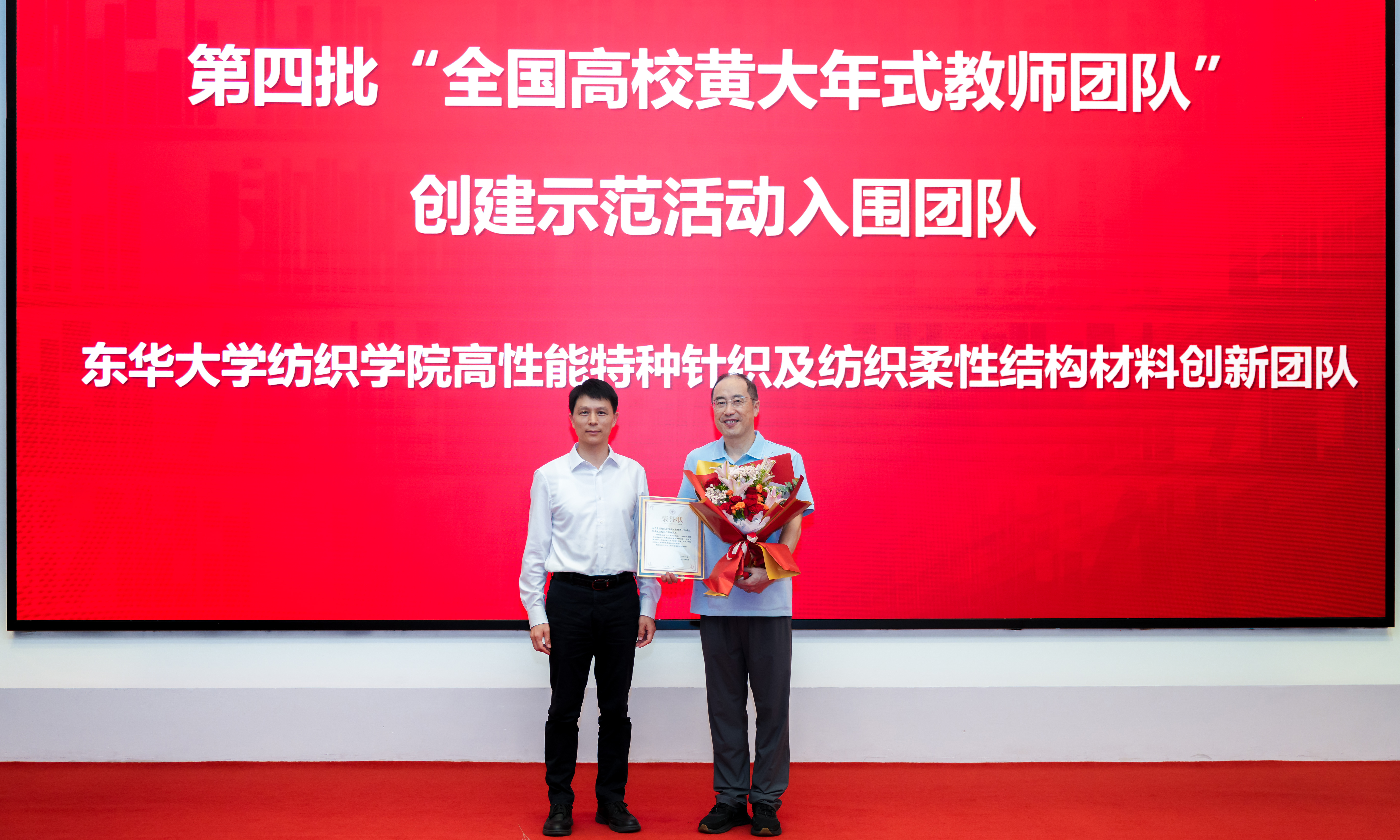 项延训为成功入围第四批“全国高校黄大年式教师团队”创建示范活动的高性能特种针织及纺织柔性结构材料创新团队颁发荣誉状。