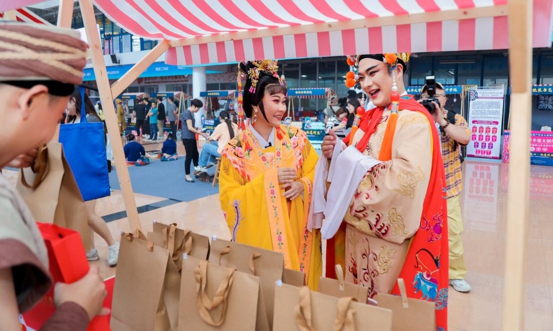 演出前,“琼韵匠心·非遗新生”创意市集活动精彩上演。原创琼剧、传统黎锦与现代文创交流、碰撞,一句句唱词、一件件作品讲述承载千年的故事,吸引师生驻足观看、体验。“指尖翻飞间,黎锦的蛙纹与吉符在经纬间渐次浮现,令人叹为观止,这是视觉与心灵的双重震撼!”服装与艺术设计学院研究生孙怡宁感慨地说。