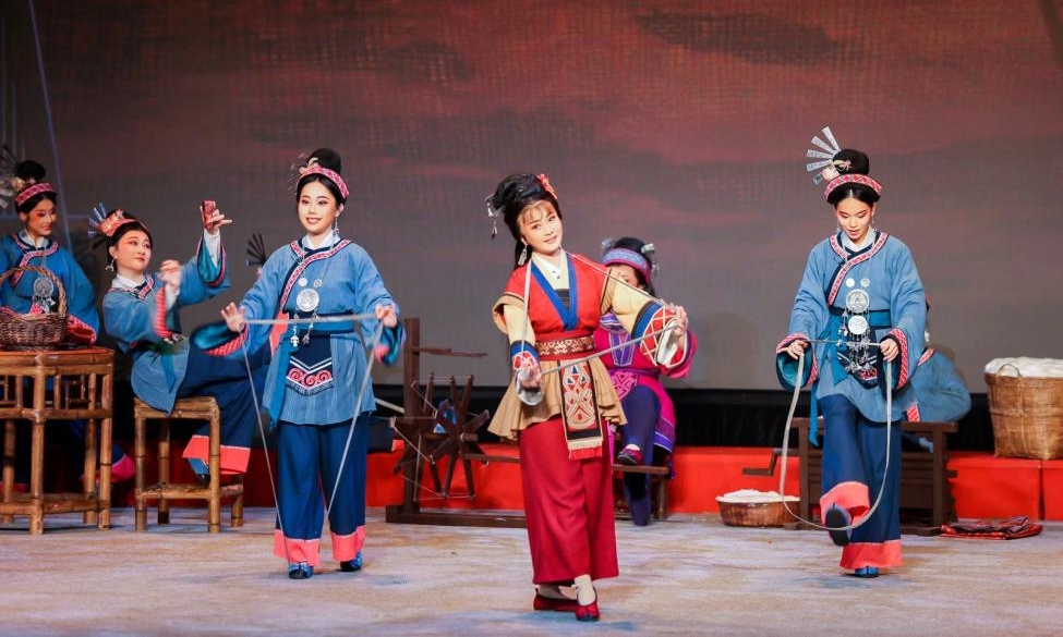 琼剧《黄道婆》以宋末元初为背景,讲述了松江府黄四娘(后被称为“黄道婆”)漂泊至崖州(今海南崖县),拜黎族峒主为师,苦学织锦技艺,并发明三锭纺车,历经三十余年不懈努力,掌握当时世界上最先进的纺纱技术,终使崖州布远销四海。当童年挚友千里寻来,泣诉松江百姓衣不蔽体之苦时,黄道婆毅然决然辞别崖州亲人,怀抱棉种返乡,重燃江南棉业之火。舞台上,演员们以精湛的演技、华美的服饰和动人的唱腔,将黄道婆的坚韧与智慧展现得淋漓尽致,收获现场观众的阵阵掌声。