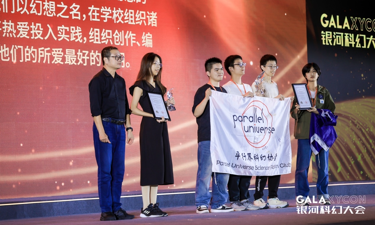 平行界科幻协会自成立以来,始终坚持以“激发想象、连接未来”为宗旨,积极组织科普活动、主题沙龙、科幻观影、作家讲座等活动,已逐步成长为上海地区具有影响力的高校科幻社团之一。颁奖典礼上,获奖学生代表从中国知名科幻作家刘慈欣手中接过奖杯。会议期间,他们还参加了由银河奖组委会主办的全国高校科幻社团联谊沙龙,与来自武汉大学、华南理工大学、哈尔滨工业大学等高校科幻社团代表深入交流,围绕社团运营、科幻创作孵化、校际合作等议题展开讨论。