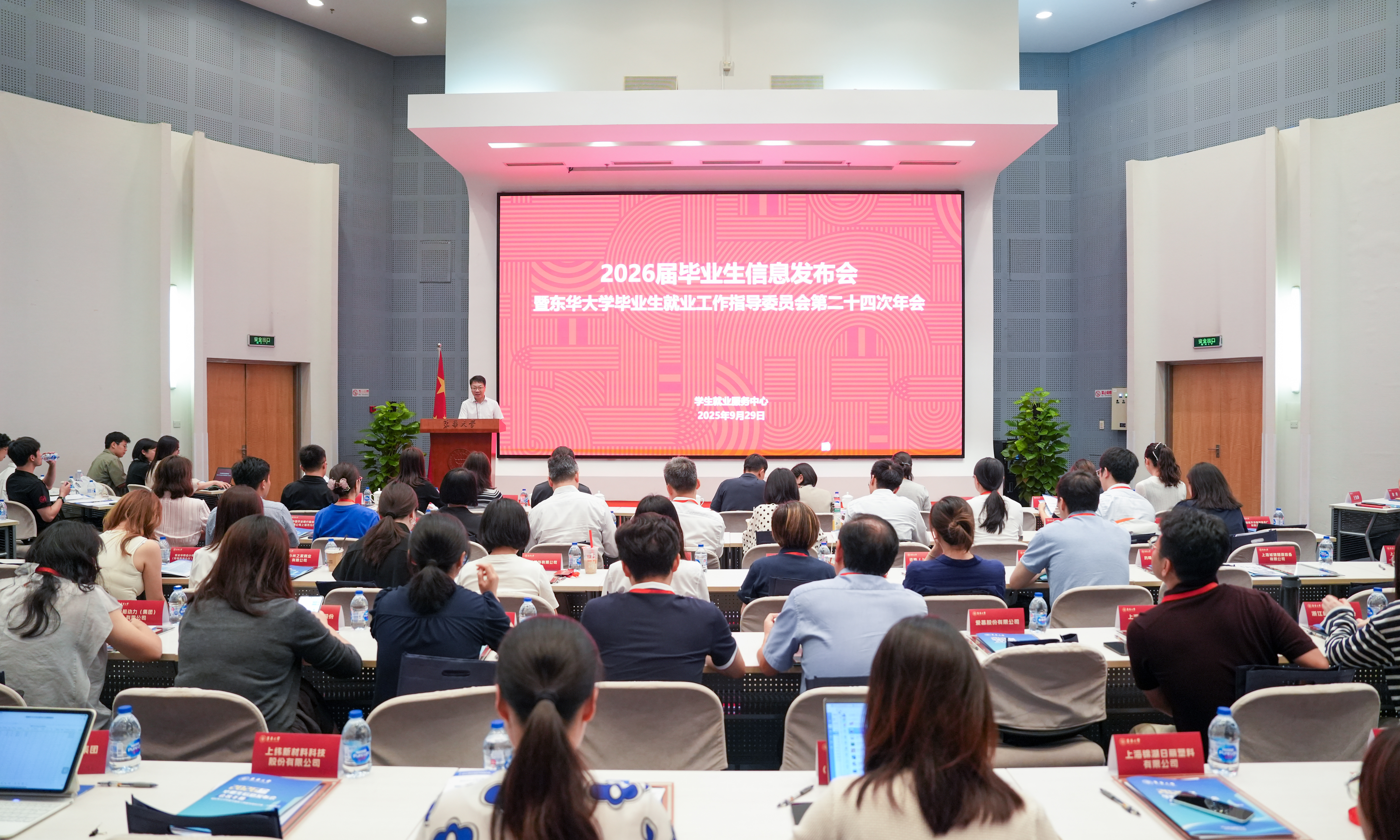9月29日,2026届毕业生信息发布会暨毕业生就业工作指导委员会第二十四次年会在松江校区召开。校长项延训、党委副书记李成龙出席,来自全国各地近百家知名企业代表,各学院和相关部处负责人参会。会议由李成龙主持。