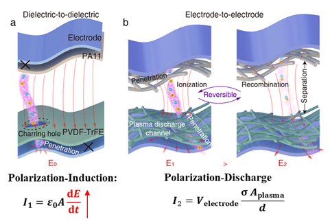 近日,材料科学与工程学院、先进纤维材料全国重点实验室王宏志/侯成义课题组提出了一种基于静电击穿效应的能量释放机制,并据此开发出等离子体增强能源纺织品(Plasma-Enabled Energy Textile, PEET)。该研究揭示了在介电极化与静电感应之间,存在一条被忽视的高效能量传递路径:通过可控的电介质击穿形成微等离子体通道,将缓慢的位移电流过程转化为快速的传导电流过程,实现了能量的快速释放与高效转换。