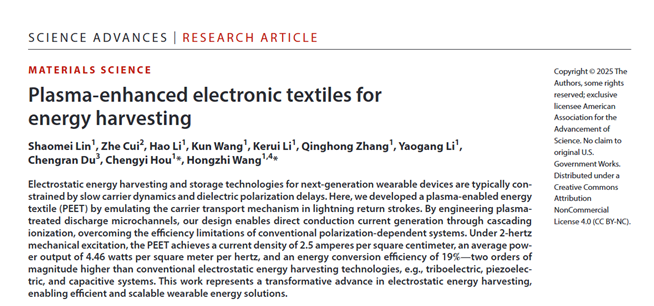 相关研究以“Plasma-enhanced electronic textiles for energyharvesting”为题发表在学术期刊Science Advances(Sci. Adv. 2025, 11,eadx2628., DOI:10.1126/sciadv.adx2628)上。材料科学与工程学院博士生林绍妹为第一作者,通讯作者为王宏志教授和侯成义研究员。该研究获得了国家自然科学基金委员会、励志计划等多方面的资助与支持。